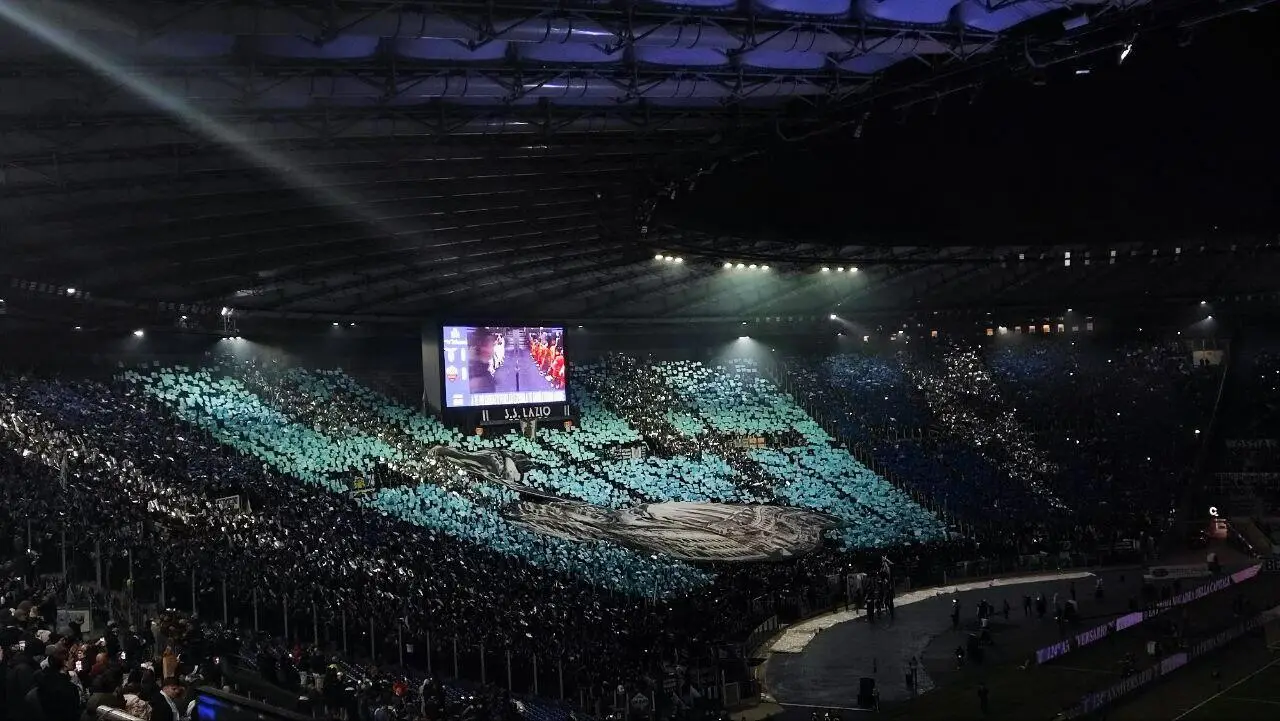 Non c'è derby della Capitale senza coreografia. La prima a “srotolare”, si fa per dire, la sua è stata la Curva Nord. Sembrava almeno, perchè durante lo svelamento la sorpresa. Un telo mai srotolato del tutto, esattamente come accaduto alla Curva Sud nel derby d'andata, accompagnato dallo striscione: "Questo è quello che ci costringete a guardare ad ogni derby". E poi "Discendenti di Marte, padroni della storia" l'altro striscione, ironico sotto la Curva.