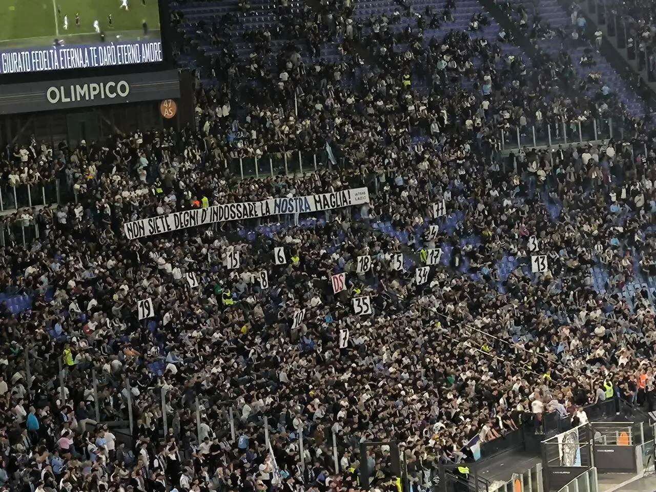I numeri dei giocatori sotto allo striscione “Non siete degni di indossare la nostra maglia”. E al centro dei numeri di maglia dei calciatori biancocelesti c'è in rosso quello con scritto “DS”. Anche durante l'esultanza del gol che sblocca la partita, quello di Felipe Anderson arrivano i fischi.