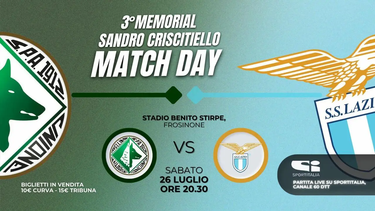 La S.S. Lazio comunica che sono in vendita i biglietti per la gara contro l`Avellino per il 3° Memorial “Sandro Criscitiello", in programma sabato 26 luglio alle ore 20:30 allo Stadio Benito Stirpe di Frosinone.